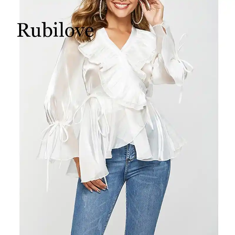 Elegante Frauen Sehen Obwohl Organza Bluse Damen Langarm Transparente Bluse Shirt Weibliche Weiss Buro Bluse Shirt Tops Blusen Hemden Aliexpress