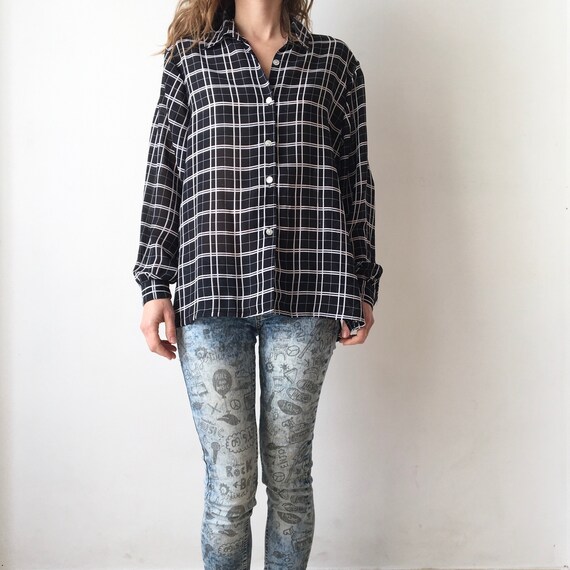 Vintage 80er Jahre Schwarz Und Weiss Kariert Transparente Bluse Etsy