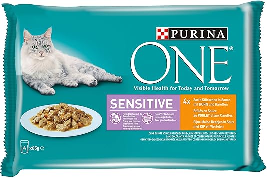 Purina One Sensitive Katzenfutter Nass Zarte Stuckchen In Sauce Mit Huhn 4er Pack 4 X 85g Amazon De Haustier