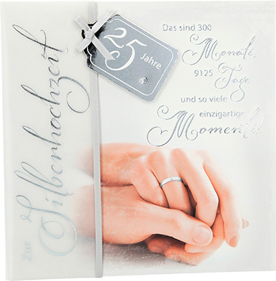 Du bekommst die Karte direkt mit passendem Umschlag und schützender CellophanHülle Die Karte hat im geschlossenen Zustand die Maße von 12cm x18 cm Innen ist die Karte blanko und du hast genügend Platz für deine Botschaft Danach einfach die Karte in den Umschlag stecken und das Geschenk ist fertig. Karte mit Spruch überreichen Nicht jedem liegt es, seinen Spruch zur Silberhochzeit vor allen Gästen zu deklamieren Trotzdem braucht man nicht darauf zu verzichten, das Festtagspaar mit einem schönen Spruch zu überraschen Man kann den Silberhochzeit Spruch auch einfach auf eine hübsche Karte schreiben, die bei der Gratulation. Unsere Wünsche zur Silberhochzeit sind wirklich sehr tiefsinnig und ausdrucksstark verfasst und genau auf das bedeutende Ereignis zugeschnitten Gestalten Sie mit uns also eine ganz besondere und eindrucksvolle Gratulation zur Silberhochzeit bzw zum 25.