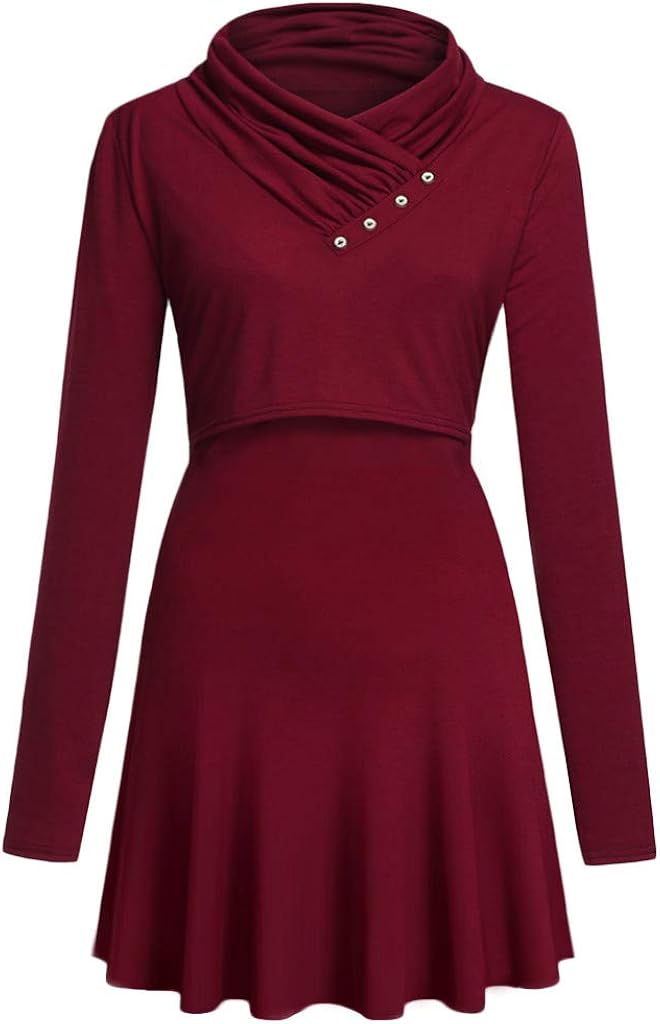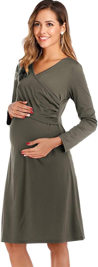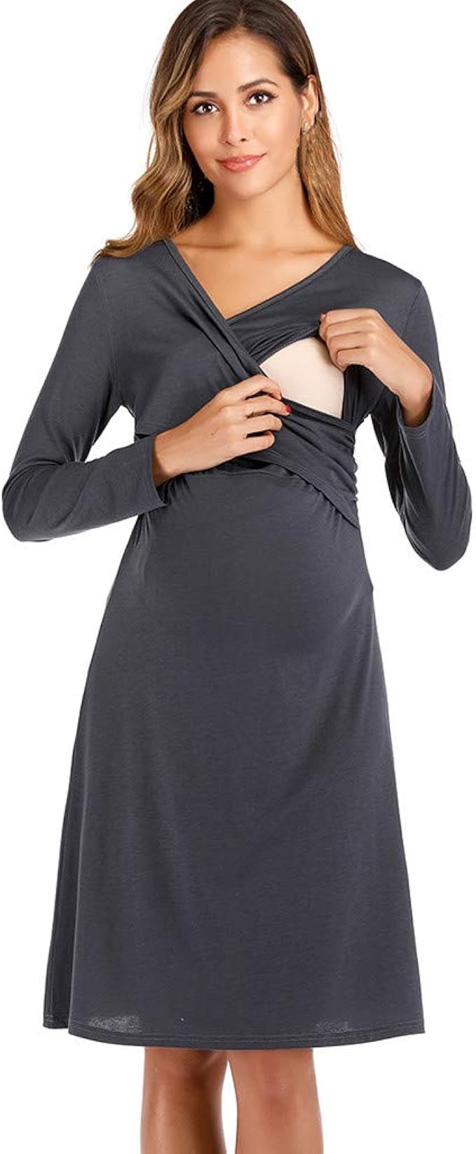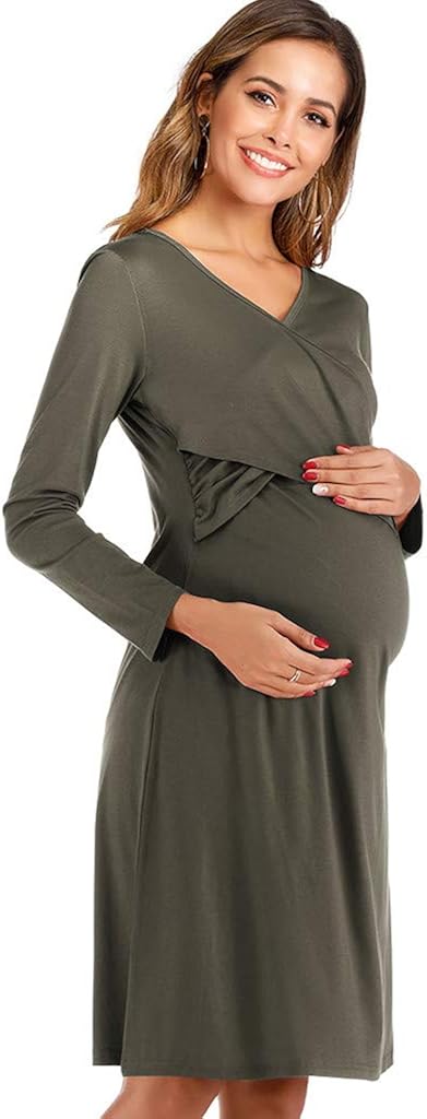 Doublehero Damen Langarm Umstandskleid Herbst Winter Elastisch Elegant Plissee Stillkleid Umstandsmode Stillnachthemd Frauen Schwangerschaft Kleid Baby Kleider