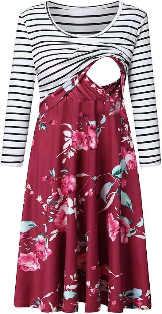 Huhu3 Damen Still Kleid Umstandskleid 2in1 Umstands Langarm Streifen Spleissen Blume Drucken Stillkleid Umstandsmode Mutterschaft Doppelschicht Stillzeit Nursing Freizeit Kleid Bekleidung Kleider