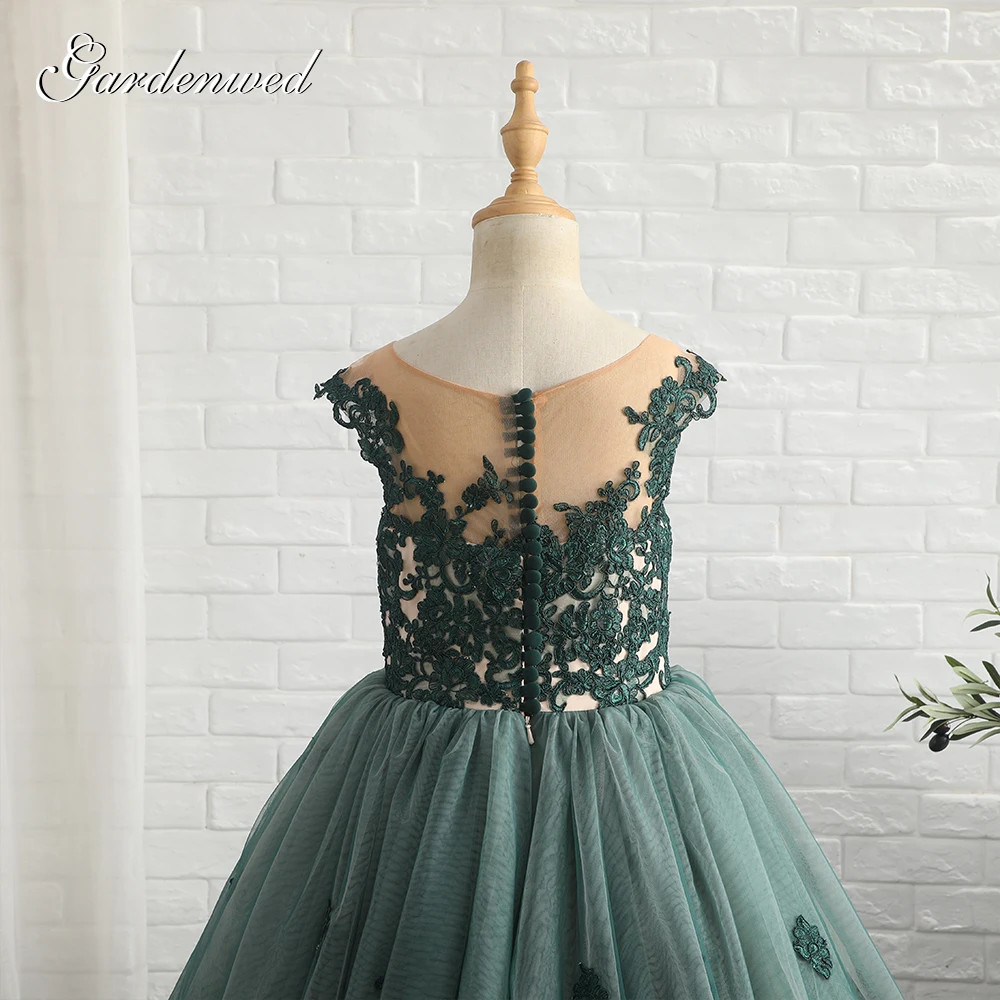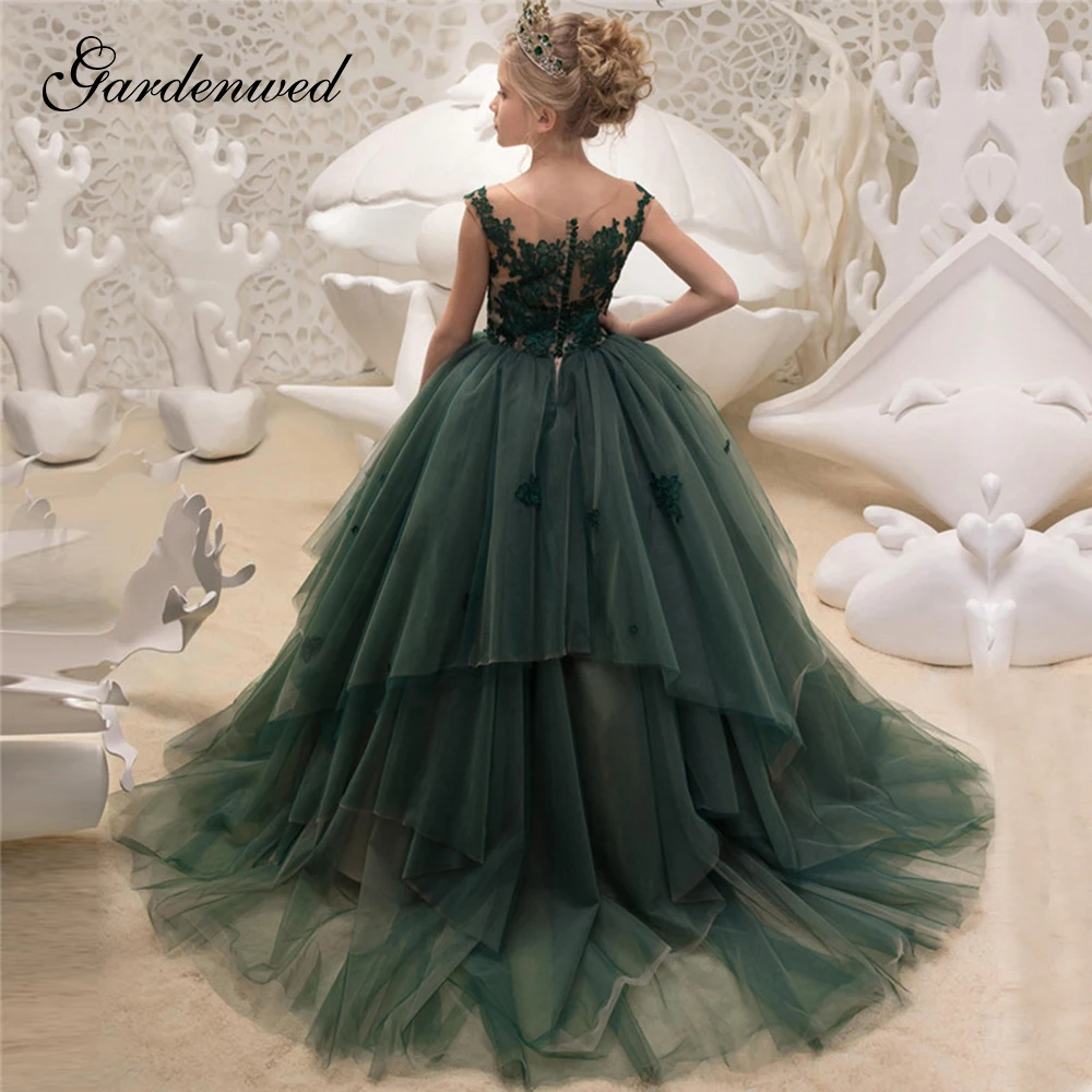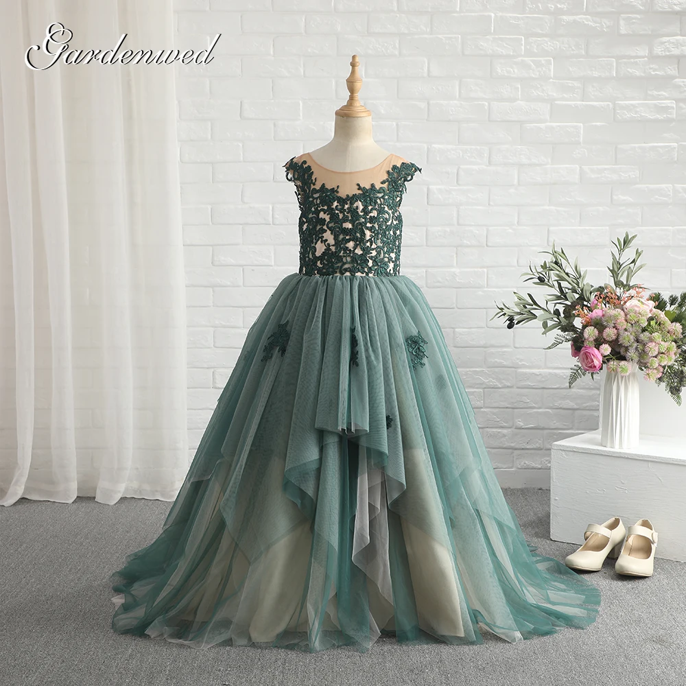 Grun Ballkleid Blume Madchen Kleider Tiered Tull Madchen Hochzeit Party Kleider Nude Spitze Appliques Lange Madchen Pageant Kleider