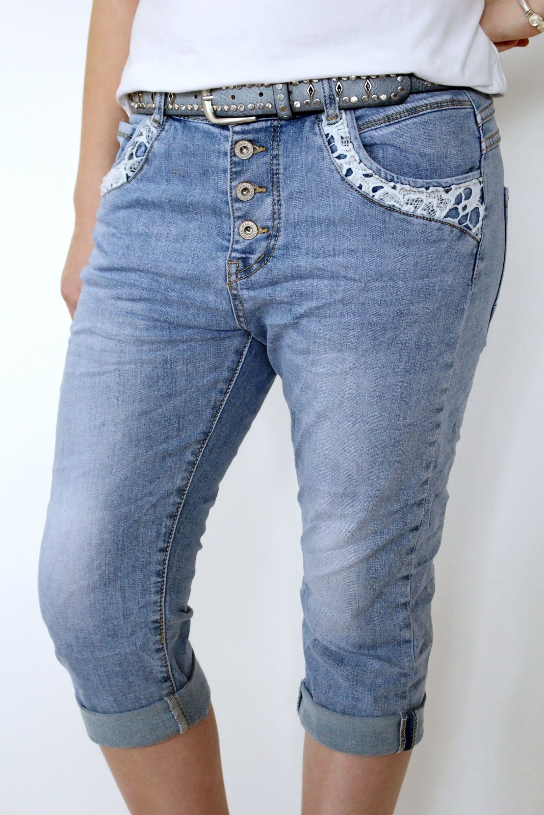 Karostar Spitze Bermuda Capri Boyfriend Baggy Jeans Hose Knopfe Blau Neu 36 48 Ebay