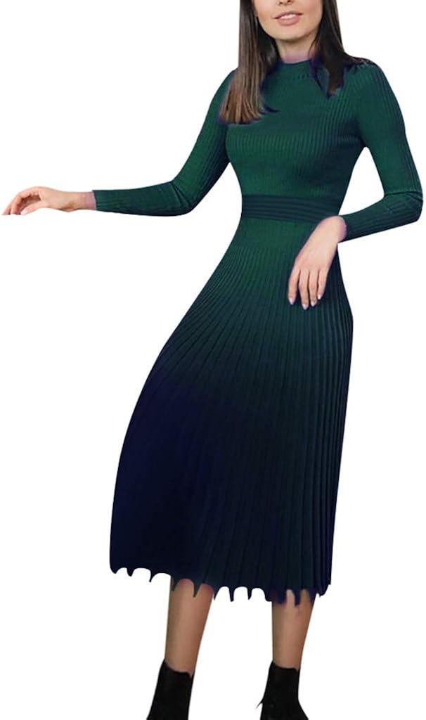Neue 13 Grune Retro Elegante Damen Langarm Rundhals Stricken Lange Winterkleid