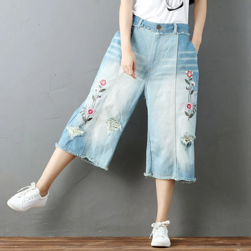 Frauen Sommer Vintage Gebleichte Locher Wadenlange Breites Bein Demin Hosen Damen Gestickte Blumen Jeans Stickerei Blume Hosen Demin Pants Jeans Embroideryfloral Jeans Aliexpress