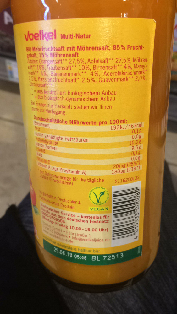 Möhrensaft (Diverse) Kalorien und Nährwerte des Lebensmittels Möhrensaft und weitere Informationen zum Gehalt an Vitaminen und Mineralstoffen. Dann habe ich die Fake Fleisch Streifen von Edeka bzw Rewe genommen, die sind super lecker und haben top Nährwerte Sie bestehen nämlich NUR aus Gemüse und haben pro 100g ganze g Protein (vor allem durch Erbsenprotein) und nur 3,9g Fett Kann ich wirklich empfehlen!. Wir haben bewusst darauf verzichtet, unseren Möhrensaft pur zu verdünnen oder zu süßen Lediglich mit etwas Zitronensaft geschmacklich abgerundet, erhalten sie den vollen Geschmack der Möhren Alles weitere entscheiden Sie selbst zB die Zugabe von Honig, Zucker, einem anderen BAD HÖNNINGER Fruchtsaft oder Mineralwasser.