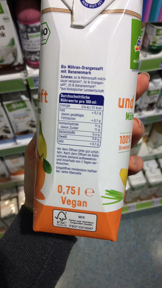 Bio Möhrensaft milchsauer vergoren (39 %), Bio Apfelsaft, Bio Mangomark (14 %), Bio Bananenmark, Bio Topinambursaftkonzentrat (2 %) Aufbewahrungshinweise und Haltbarkeit Geöffnete Flasche kühl aufbewahren und innerhalb von einer Woche aufbrauchen Haltbarkeit nach Anbruch Innerhalb von einer Woche aufbrauchen. Kalorien für Möhrensaft Gemüsesäfte Kalorientabelle, kostenloses Ernährungstagebuch, Lebensmittel Datenbank. Gemüsesaft ist laut deutschem Lebensmittelbuch das unverdünnte, zum unmittelbaren Verzehr bestimmte, gärfähige und unvergorene oder milchsauer vergorene, flüssige Erzeugnis aus Gemüse Gemüsesaft kann danach auch aus Konzentrat von Gemüsesaft oder mark hergestellt werden Er ist ein Getränk zur menschlichen Ernährung, ein Lebensmittel.