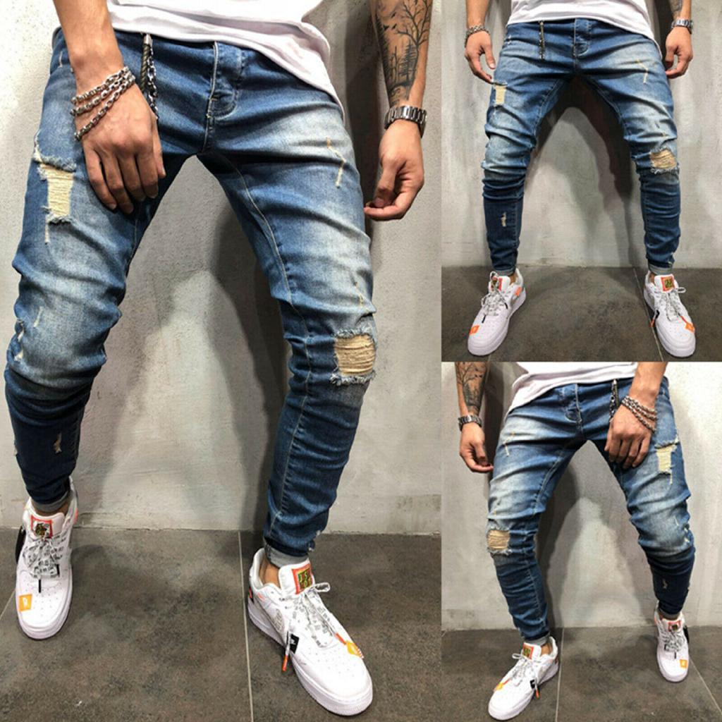 Fashion Mens Skinny Jeans Destroyed Casual Pencil Pants Low Waist Denim Trousers Herren Jeans