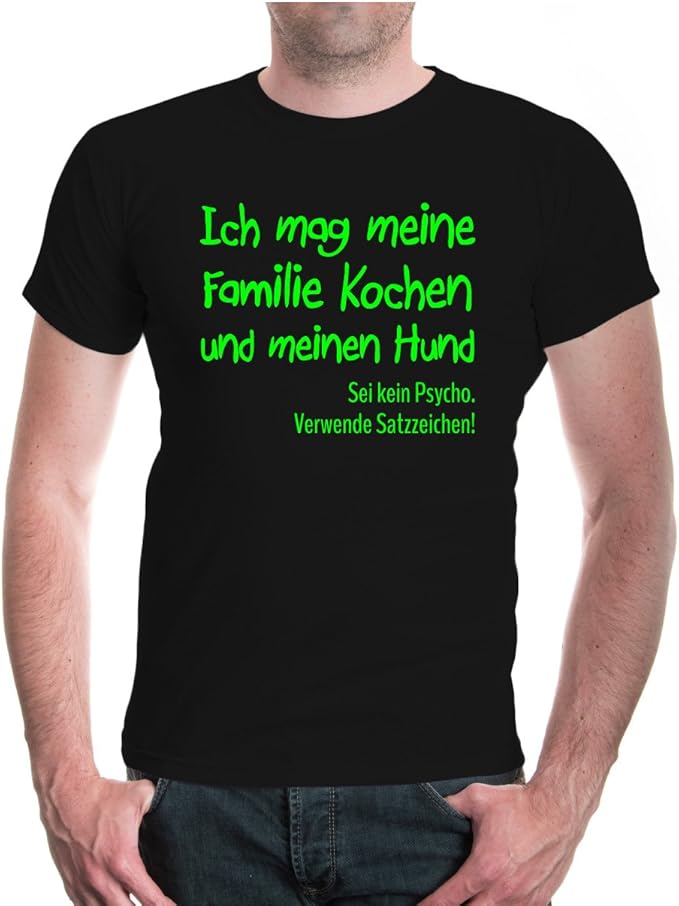 Klassisch geschnitten, doppelt genähter Saum. Ich mag meine Familie kochen und meinen Hund Sei kein Psycho(path) Verwende Satzzeichen Cooles Geschenk für Weihnachten, zum Geburtstag oder für jeden anderen Anlass Lustiges Design für alle, die viel Wert auf grammatikalisch einwandfreie Sätze legen Witzig für den Deutschunterricht von dem Deutschlehrer, Lehrer und Lehrerin.