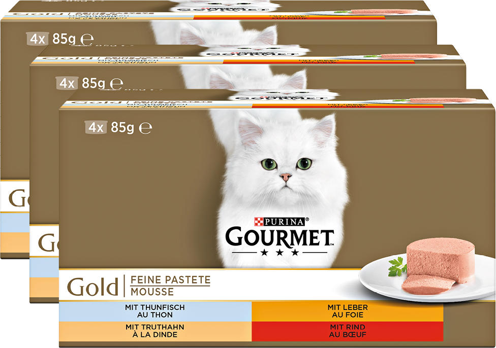 GOURMET ™ Gold Katzenfutter ist ein Alleinfutter für Katzen Eine ausgewachsene Katze (3 5 kg) benötigt 3 bis 4 Dosen pro , die auf mindestens 2 Mahlzeiten verteilt werden sollten Bitte zimmerwarm servieren und stets frisches Wasser bereitstellen. Gourmet Gold Katzenfutter 24er MixPack (2 x 12 x 85g) Pastete mit Truthahn und mit Seelachs Edler Genuss Mit den feinen Pasteten von GOURMET Gold erhält Ihr Liebling für eine sorgfältig zubereitete Überraschung, die auch anspruchsvollen Samtpfoten ein zartes Genusserlebnis bietet. Gourmet Gold Feine Pastete Truthahn 12 x 85g Katzenfutter Sie möchten Ihrer Samtpfote einen besonderen Festtagsschmaus präsentieren?.
