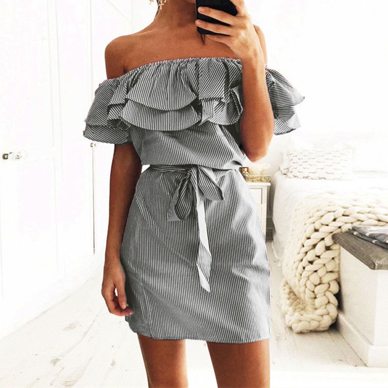 Women Off Shoulder Striped Shirt Dress Belt Casual Summer Beach Swing Sundress