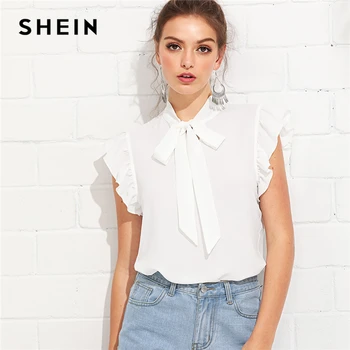 Shein Weiss Elegante Arbeitskleidung Volant Schulter Gebunden Neck Stehkragen Ruschen Bluse Sommer Frauen Wochenende Casual Shirt Top Leather Bag