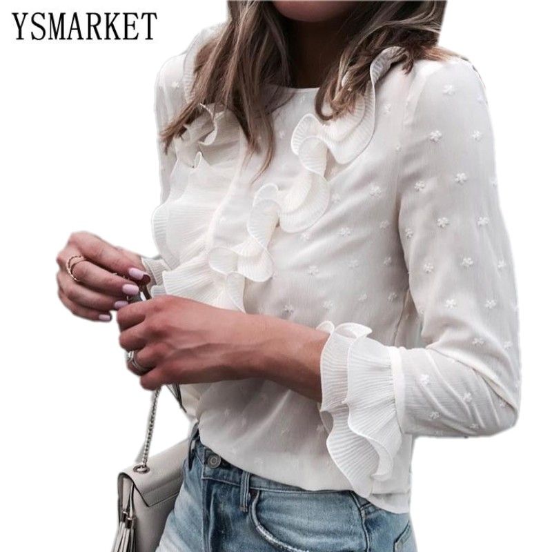 Grosshandel Ysmarket Frauen Damen Blusen Elegante Casual Ruschen Spitze Polka Dot O Neck Shirt Langarmshirts Bluse Weiss Mode E0984 Von Yannisfashion 10 45 Auf De Dhgate Com Dhgate