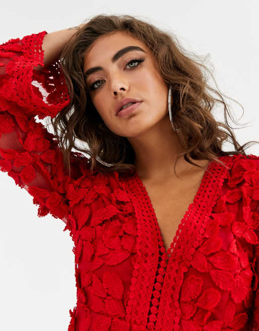 Love Triangle Floral Embroidered Long Sleeve Dress In Red Asos