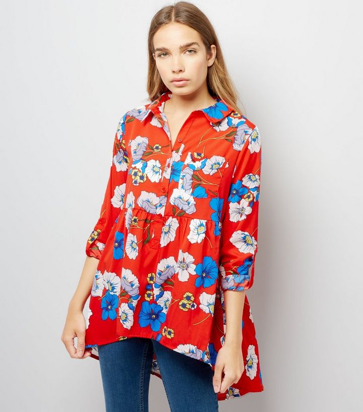Umstandsmode Rote Bluse Mit Gestuften Schosschen Und Blumenmuster New Look