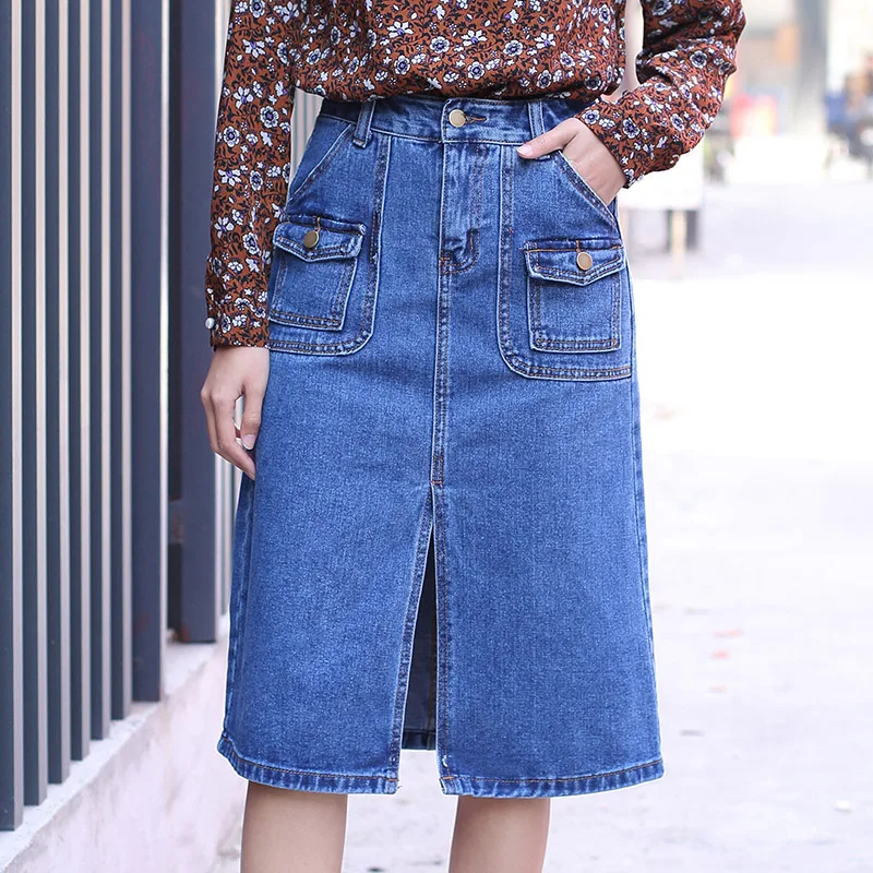 Yichaoyiliang Frauen Hohe Taille Knielangen Jeansrock Fronttaschen Sexy Schlitz Adrette Madchen Jeans Rock Casual Bottoms Denim Skirt Knee Length Denim Skirtsjeans Skirt Aliexpress