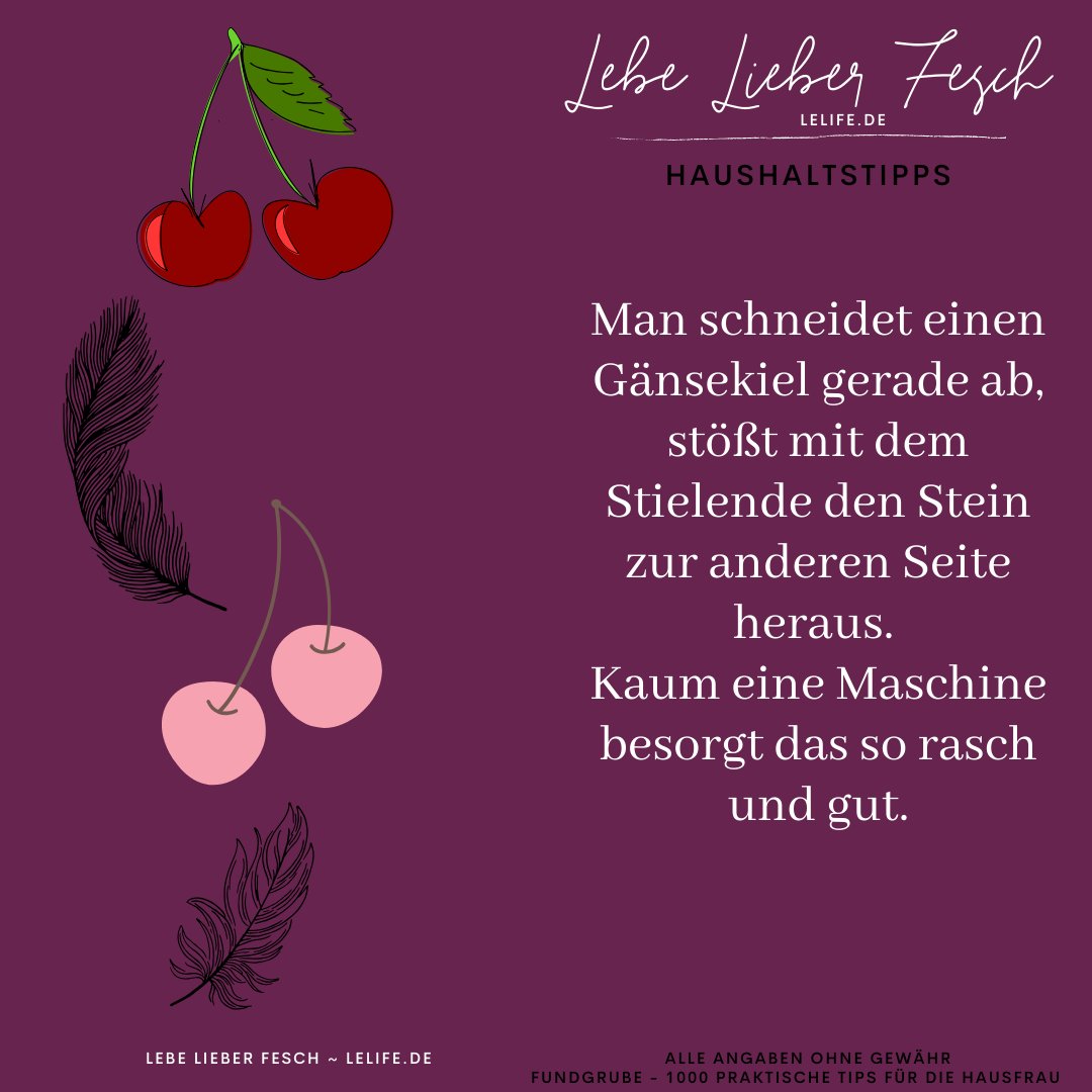 Lelife Haushaltstipps Aussteinen Von Kirschen Man Schneidet Einen Gansekiel Gerade Ab Stosst Mit Dem Stielende Den Stein Zur Anderen Seite Heraus Kaum Eine Maschine Besorgt Das So Rasch Und Gut