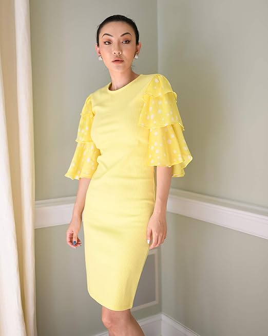 The Drop Geripptes Kleid Fur Damen Mit Gestuften Ruschenarmeln Zitronengelb Weiss Gepunktet Von Jessicawang S Amazon De Bekleidung