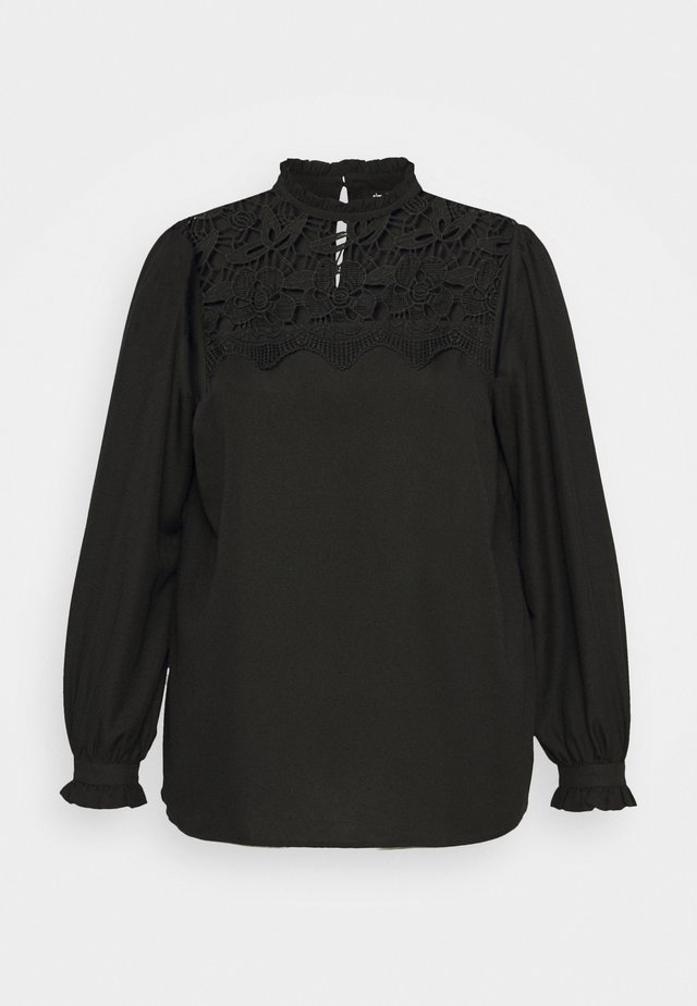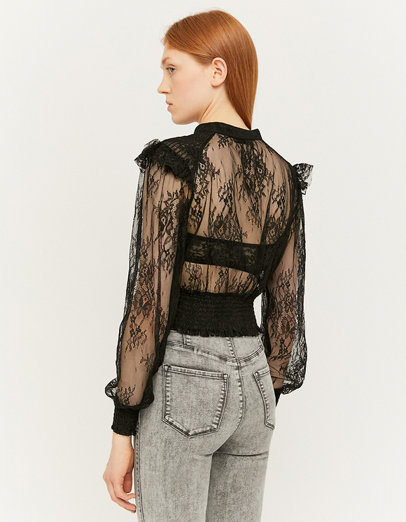 Schwarze Bluse mit Spitze am Oberteil und an den langen Ärmeln, Rundausschnitt und Gummizug am Saum.