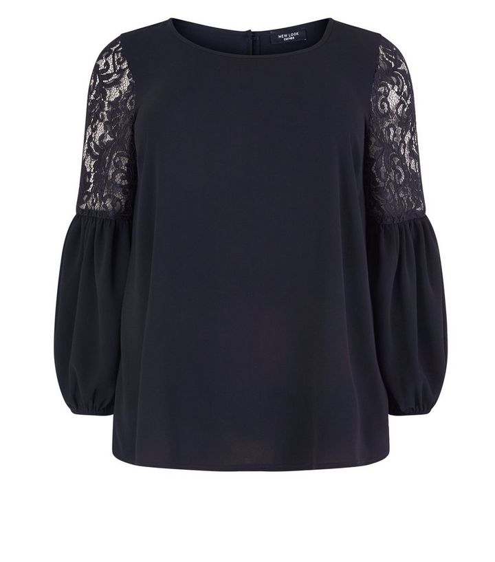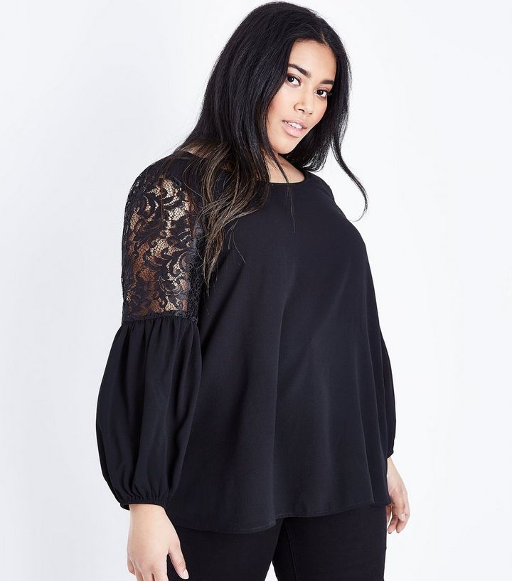Curves Schwarze Bluse Aus Spitze Mit Ballonarmeln New Look