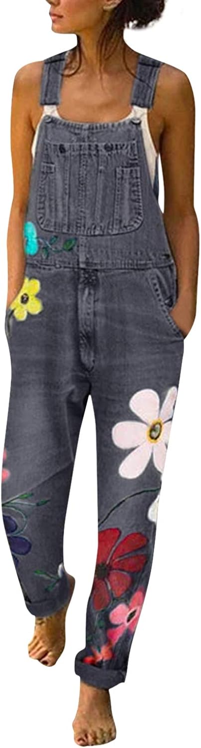 De Feuilles Damen Latzhose Mit Blumenmuster Sommer Herbst Jeans Hosen Lang Denim Overall Jumpsuit Gerades Bein Mit 5 Taschen Madchen Casual Denim Fraizeithose