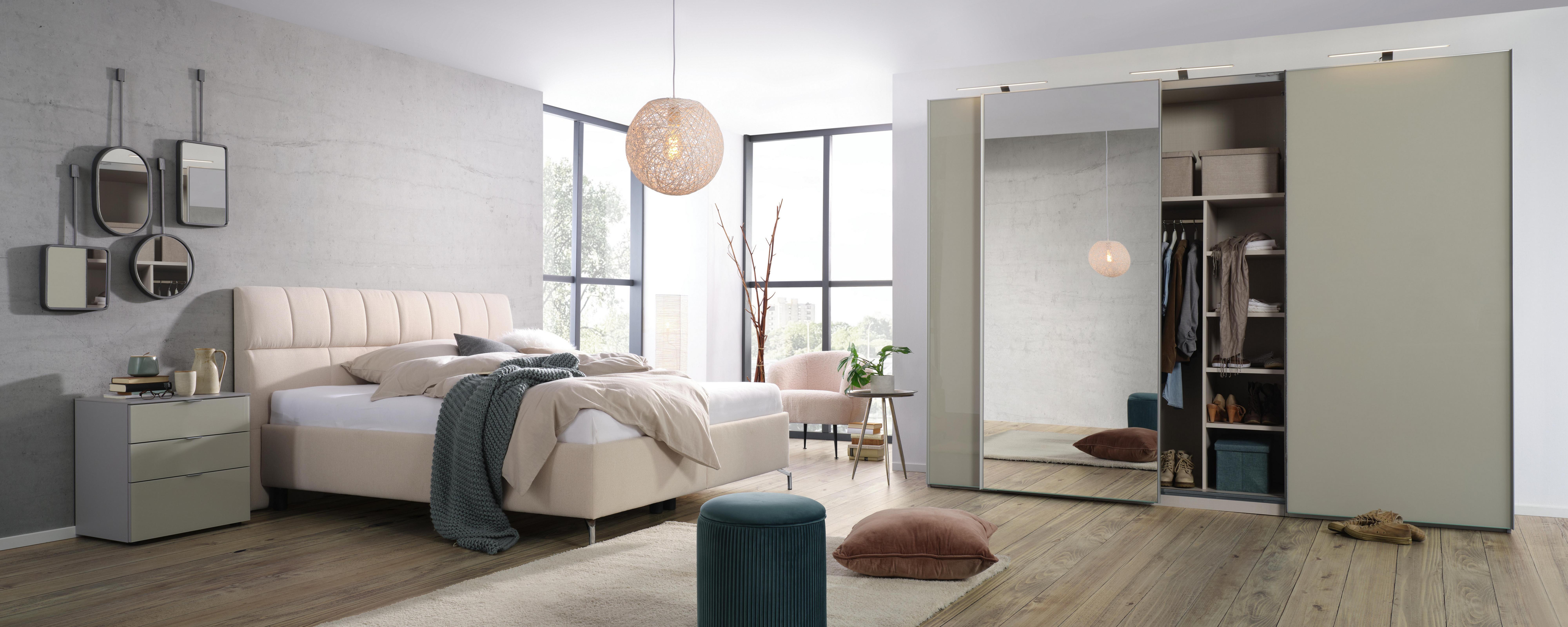 Mit wenigen Accessoires Highlights setzen;. Moderner Stil Geradliniges, minimalistisches Polsterbett mit dezenter Farbgebung;. Polsterbett mit verziertem Kopfteil und Ornamenten;.