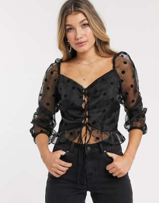 Outrageous Fortune Schwarz Gepunktetes Organza Oberteil Mit Ballonarmeln Und Schnurung Vorn Iebem Morelos