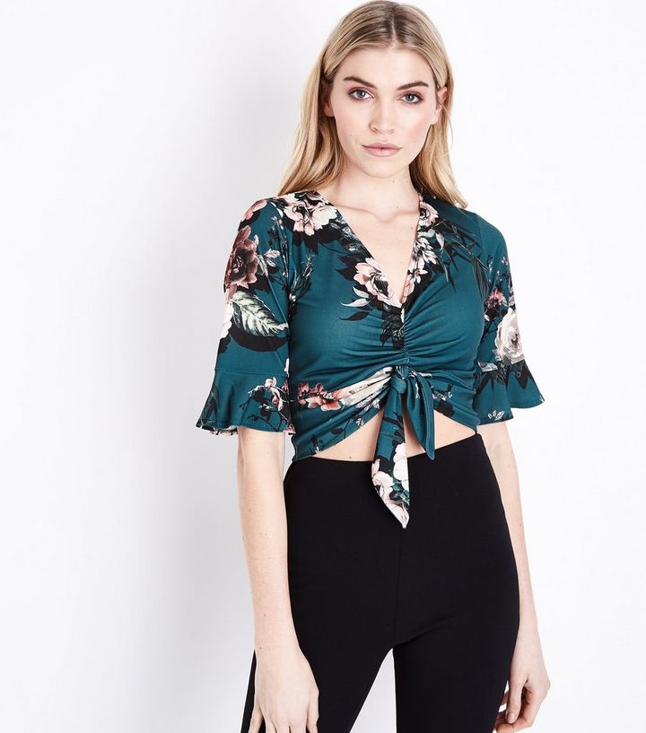 Grunes Crop Top Mit Blumenmuster Und Schnurung Vorne New Look