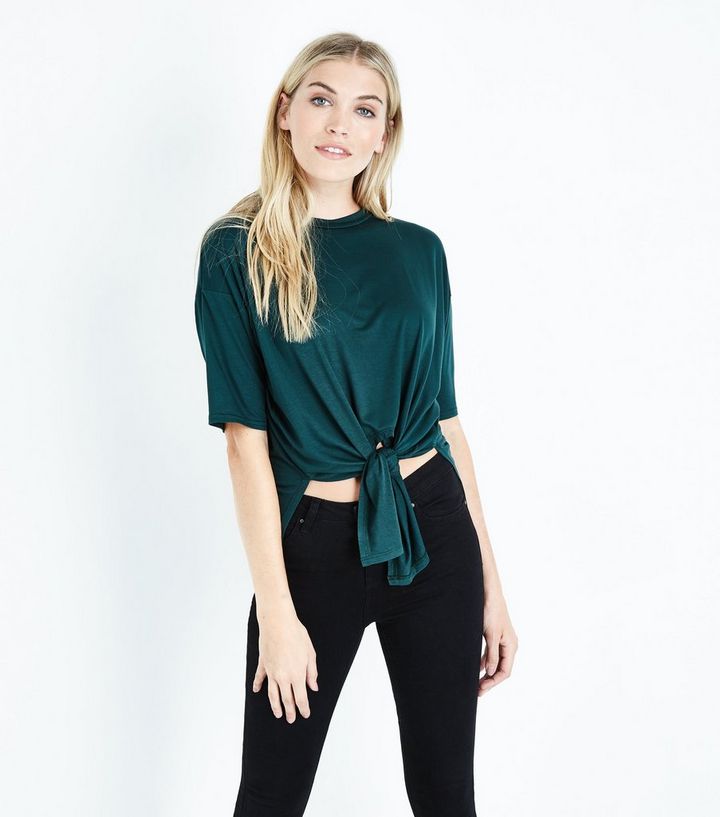 Dunkelgrunes T Shirt Mit Schnurung Vorne New Look