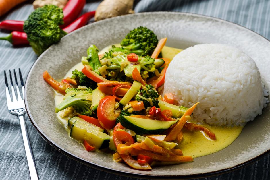 Hahnchenstreifen Mit Gemuse Und Kokossosse Aus Dem Wok Dazu Reis Rezept Eat Smarter