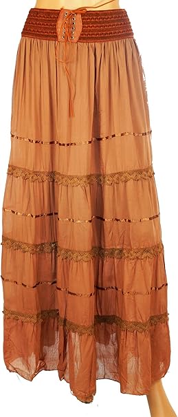Damen Sommer Rock Maxirock Langrock Stufenrock Hippy Boho Glocker Mit Spitze One Size Braun Amazon De Bekleidung