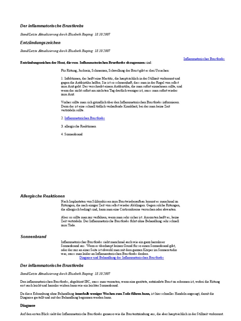 Brustkrebs erkennen Früherkennungsuntersuchungen Frauen sollten einmal im Monat die Brüste abtasten, um mögliche Veränderungen frühzeitig erspüren zu können Je früher Brustkrebs erkannt wird, desto besser sind die Heilungschancen. Hallo an alle, Habe mich erst angemeldtet in diesem Forum Aber ich lese fast 2 Jahre regelmäßig die Beiträge Sozusagen bin ich ein stilles Mitglied dieses Forums Bin im Juli 08 an Brustkrebs erkrankt Chemo,,30 Bestrahlungen dazu Zoladex u Tamoxifen nach ein paar Monaten umstellung auf Femara Gelenkschmerzen Abgeschlagenheit usw die häufigsten Nebenwierkungen , wie die meisten. Schwellungen oder Rötungen der Brust und narbiges Aussehen der Haut (erinnert an die Oberflächenbeschaffenheit von Orangenschalen) können Anzeichen des inflammatorischen Brustkrebses sein.