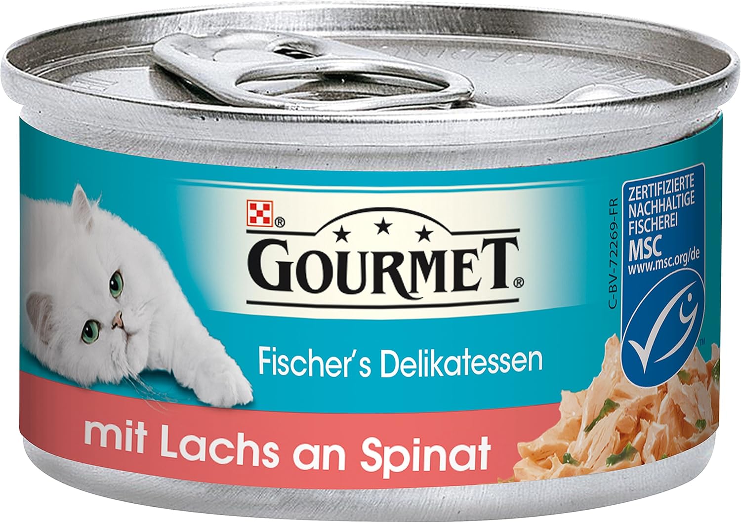 Gourmet Fischer S Delikatessen Katzenfutter Lachs Und Spinat 12er Pack 12 X 85 G Dosen Amazon De Haustier