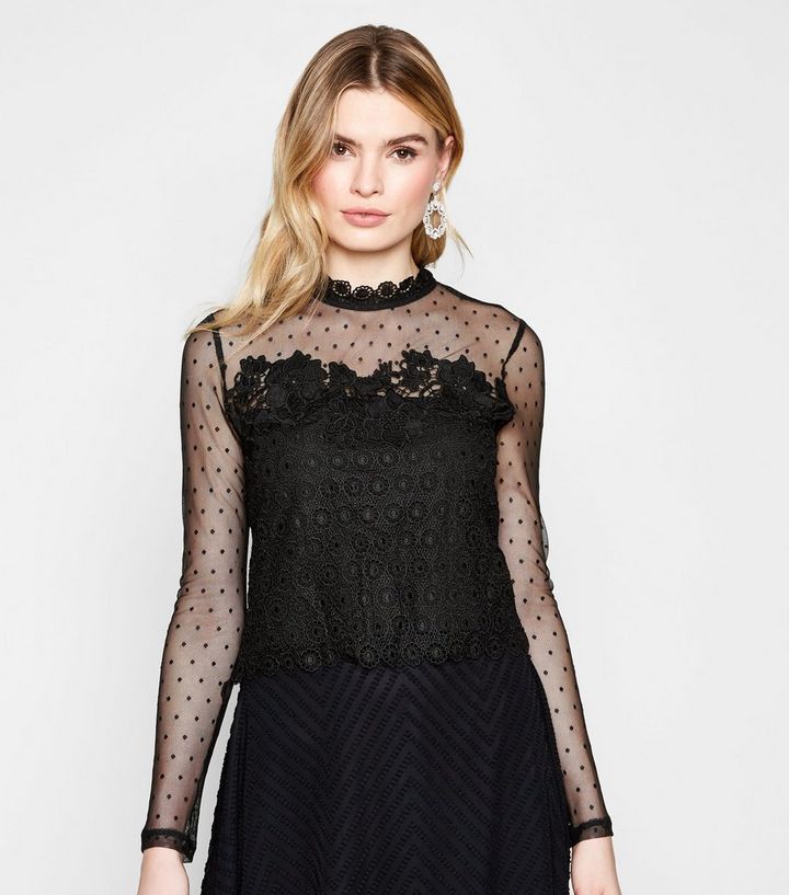 Schwarzes Langarmliges Top Aus Spitze Und Netzstoff New Look