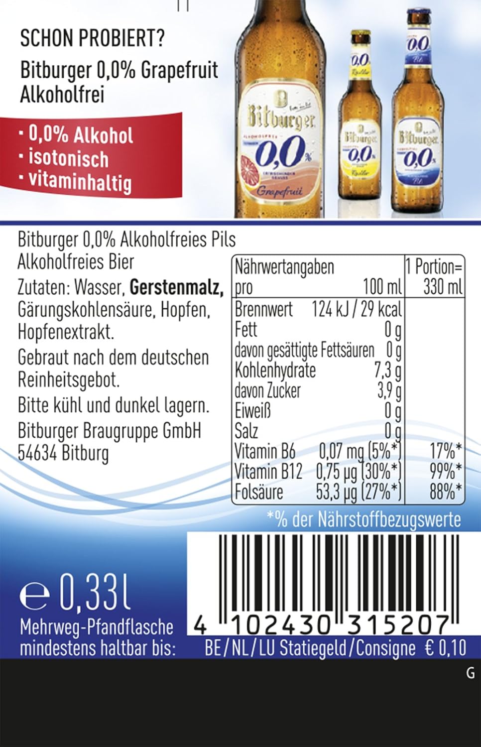 Bitburger Bitburger 0 0 Alkoholfreies Pils 29 0 Kalorien Kcal Und Inhaltsstoffe Das Ist Drin