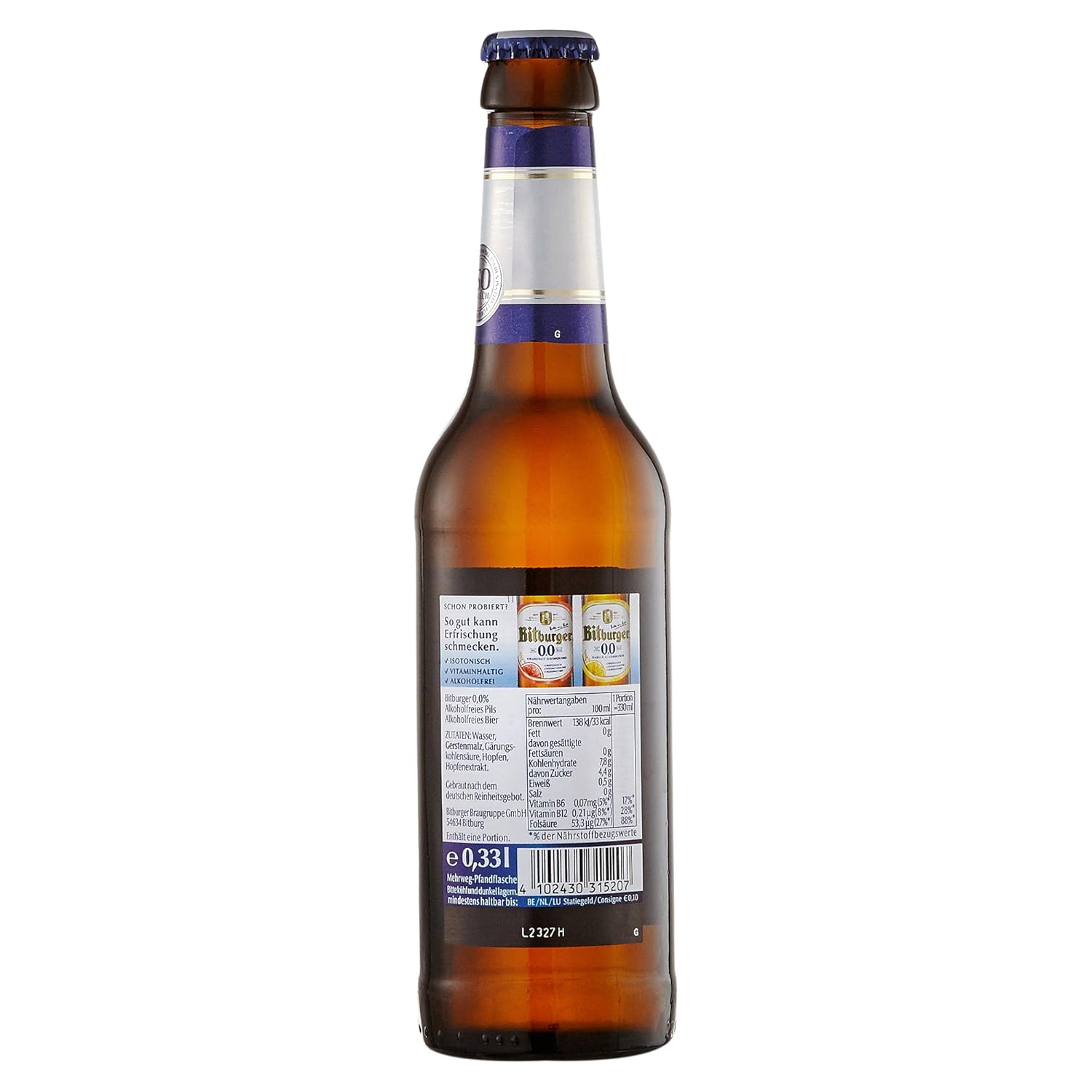Energy (kcal) 18kcal fat 0g carbohydrate 35g sugars 01g protein 06g Related products Bitburger Drive Lager 005% – 6/12 x 330ml. Bitburger 00% Apple tastes fruity fresh and is alcoholfree Enriched with vitamins for isotonic effect it is the perfect refreshing drink without alcohol The refreshing alternative to Apple Spritzers and soft drinks The only isotonic nonalcoholic with 00% alcohol Facts and figures Alcohol 00% vol Calorific value 26 kcal (111 kJ. Buy Bitburger 00 nonalcoholic beer for only €119 Order easily online Safe delivery Buyer protection Alkoholfrishop uses cookies to improve your user experience on the website By continuing to use this site you agree to our use of cookies in accordance with our Cookie Policy.