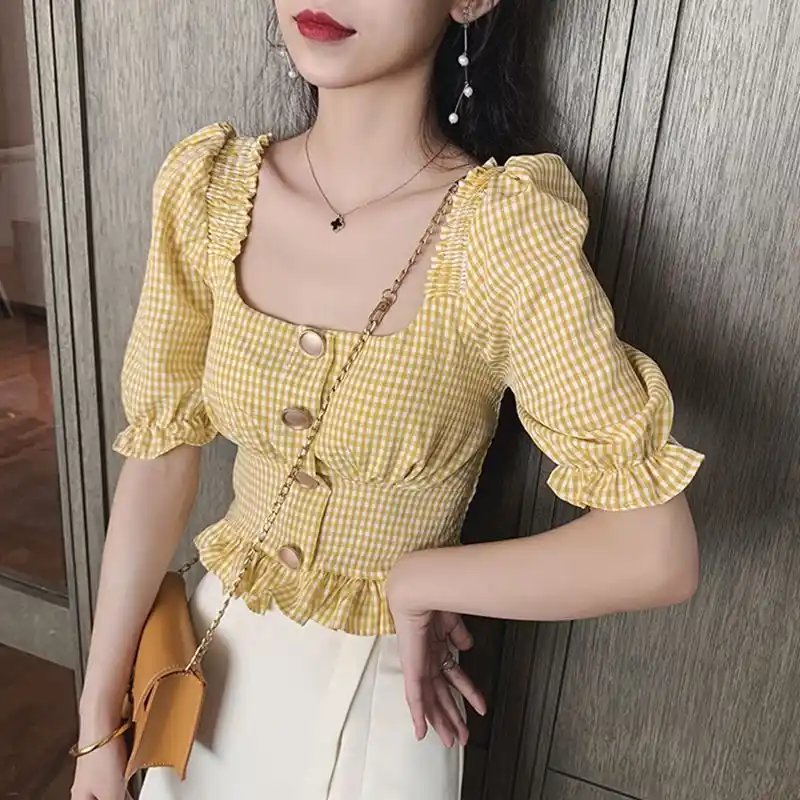 Plaid Ruffle Square Neck Puff Sleeve Summer Slim Cute Sexy Shirt Color Block Blouse Damen Oberteile Black Red Yellow Pink Tops Blouses Shirts Aliexpress