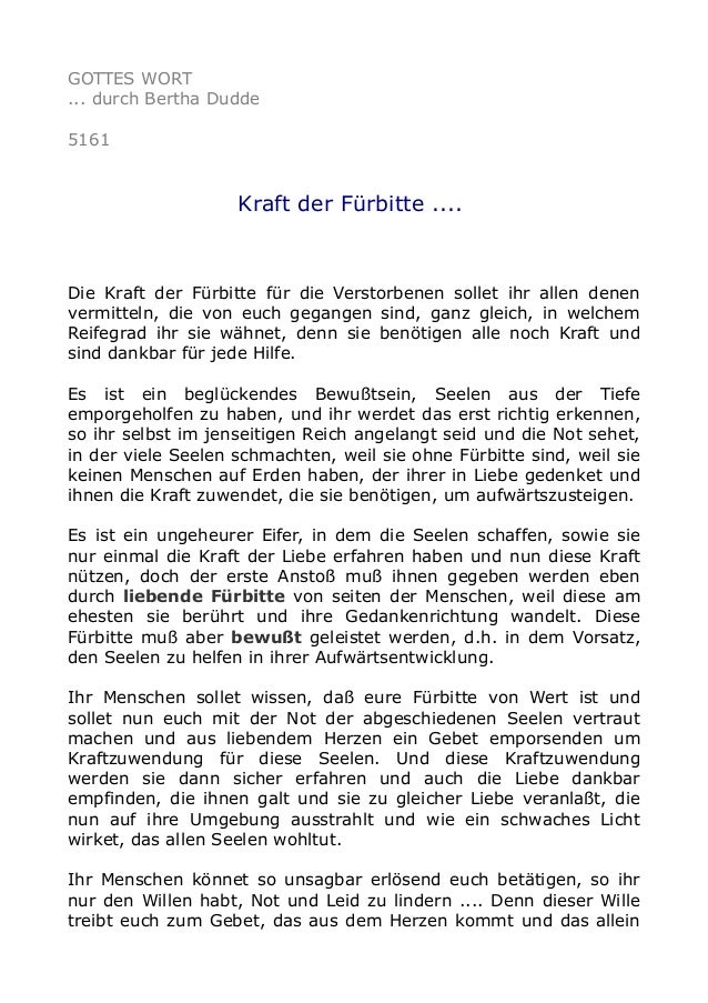 Die Fürbitte ist eine besondere Form des Gebetes man richtet sich darin an Gott, nicht etwa um sich seiner selbst Willen, sondern man bittet Ihn um etwas für jemand AnderenDies kann man sowohl im persönlichen Gebet als auch in der kirchlichen Gemeinschaft tätigen Fürbitten sind auch als Akt der Nächstenliebe zu sehen Es schadet nicht, sich nach einem stressvollen , der vielleicht. Auch Verstorbene oder kranke und notleidende Menschen können mit in die kleinen Gebete aufgenommen werden Unbedingt beachten solltest du jedoch, dass du dich mit den anderen Hochzeitsgästen abstimmst, damit sich eure Fürbitten nicht zu stark ähneln oder gar wiederholen. Dein Engel ist immer bei dir und hilft dir bei deinen Entscheidungen wenn du ihn darum bittest Oft rettet er uns auch das Leben und wir haben es vielleicht gar nicht gemerkt!.