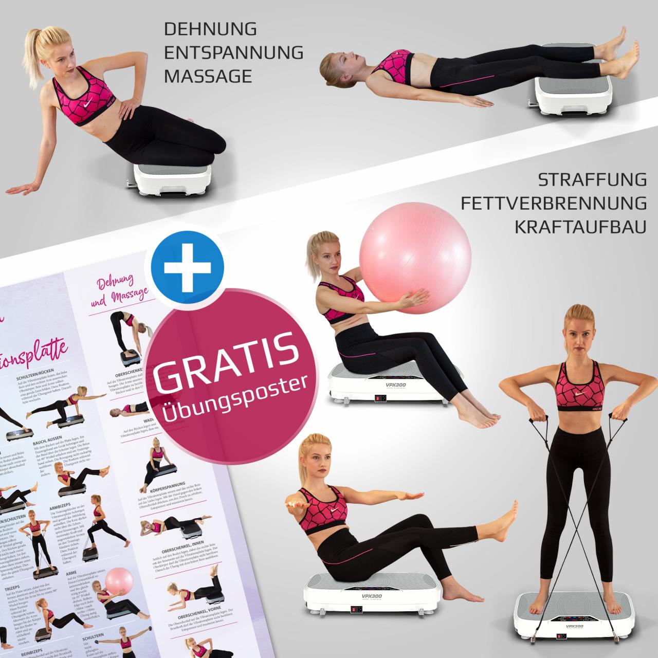 TRAININGSEFFEKTE Durch die Vibration in Kombination mit zB Kniebeugen oder Liegestützen auf der Vibrationsplatte werden zusätzlich viele kleine Muskelfasern aktiviert PRODUKTEIGENSCHAFTEN DIN A1 Format mit 30 bewährten Vibrationsplatten Übungen zum Nachmachen Ausführliche, einfach zu lesende Trainingsanleitung. Jetzt im neuen Look Dieses Übungsposter zeigt Ihnen 29 wirkungsvolle Übungen, für das Training auf einer Vibrationsplatte. 10 effektive Vibrationsplatte Übungen Im folgenden stellen wir Ihnen 10 grundlegende und effektive Vibrationstraining Übungen und hilfreiche Tricks vor Gerade zu Beginn können Sie sich mit diesen Übungen Ihr individuelles Vibrationsplatte Training zusammenstellen Denken Sie immer an die maximale Trainingszeit von 1015 Minuten.