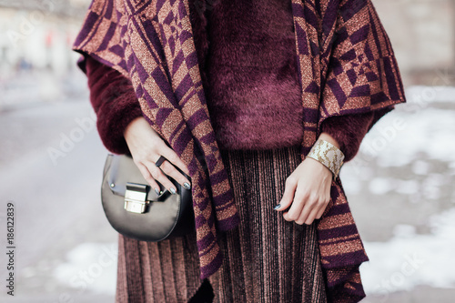 Frau Tragt Pleece Rock Schal Mit Glitzernden Faden Fell Jacke Und Schwarze Tasche Buy This Stock Photo And Explore Similar Images At Adobe Stock Adobe Stock