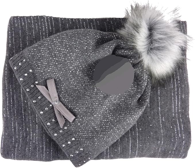 Laura Damen Mutze Schal Set Glattstrick Mit Fell Pompon Versch Farben One Size Grau Dunkelgrau Amazon De Bekleidung