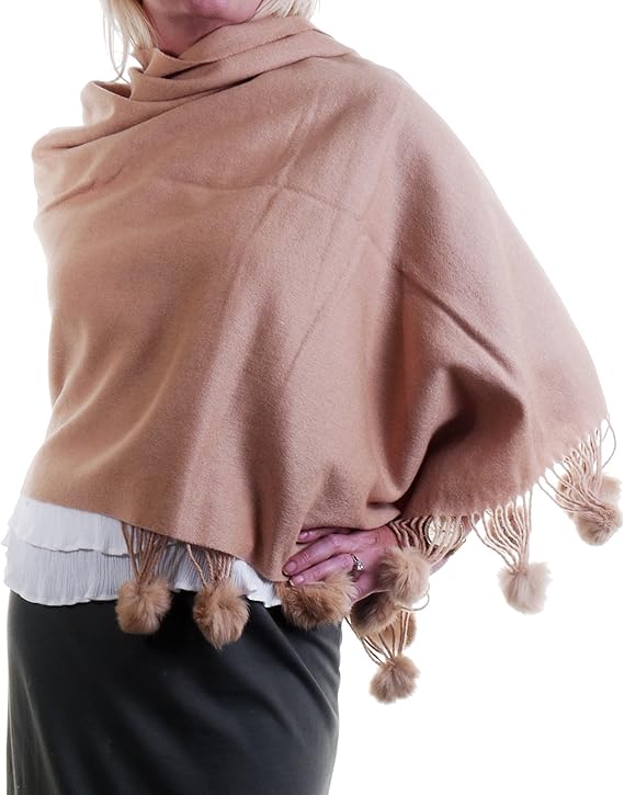 Primo Sacchi Grosse Damen Wolle Rich Tan Schal Oder Wrap Mit Fell Trimmen Oder Pom Poms Amazon De Bekleidung