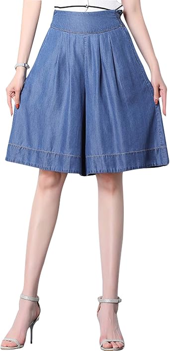 Omoone Womens Wide Leg Elastic Waist Thin Short Tencel Denim Pants Culotte Skirt At Amazon Women S Jeans Store