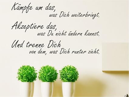34 Kämpfe nicht, wenn du durch einen Sieg nichts gewinnst George S Patton 35 Wer mit Monstern kämpft, sollte aufpassen, dass er nicht zum Monster wird Und wenn man lange in einen Abgrund blickt, blickt der Abgrund auch in einen hinein Friedrich Nietzsche 36 Ältere Männer erklären den Krieg Aber es ist die Jugend, die kämpfen. Die Größe und Farbe bitte oben nach Ihren Wünschen auswählen und den Artikel in den Warenkorb vom Shop legen Sollte Ihre gewünschte Große oder Farbe nicht dabei sein, wenden Sie sich bitte über das Kontaktformular oder direkt per Email an info@foliendesignskde Wir werden Ihnen dann ein individuelles Angebot erstellen. Kämpfe um das, was dich weiter bringt Akzeptiere das, was du nicht ändern kannst Und trenne dich von dem, was dich runterzieht ))) akzeptiere was du nicht ändern kannst sprüche.