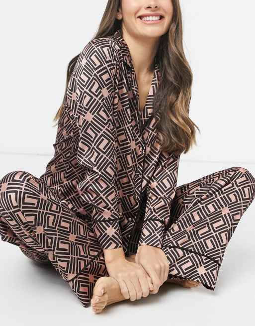 Asos Design Hochwertiges Braunes Pyjama Set Mit Hemd Und Hose Aus Satin Mit Monogramm Asos