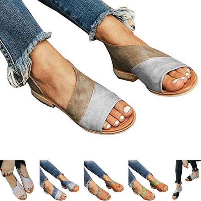 New Sommer Damen Peep Toe Spitze Flache Sandalen Pu Atmungsaktive Schuhe H J Ebay
