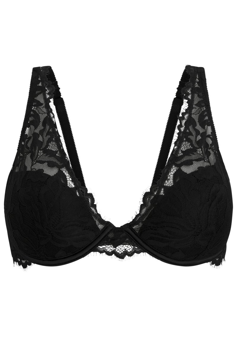Romantische Spitze im wunderschönen Nachtschwarz küsst Ihre Brüste und legt sich wie ein Kunstwerk auf Ihre Haut Dieser Triangel BH der Serie Emma begeistert durch einen umwerfenden Schnitt, hochwertige Materialien und durch viel Liebe zum Detail.