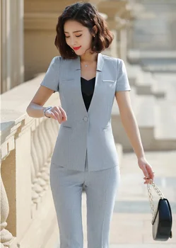 19 Summer Formal Professional Business Women Suits With Jackets And Pants Female Trousers Sets Summer Blazers Outfits Gray Leather Bag