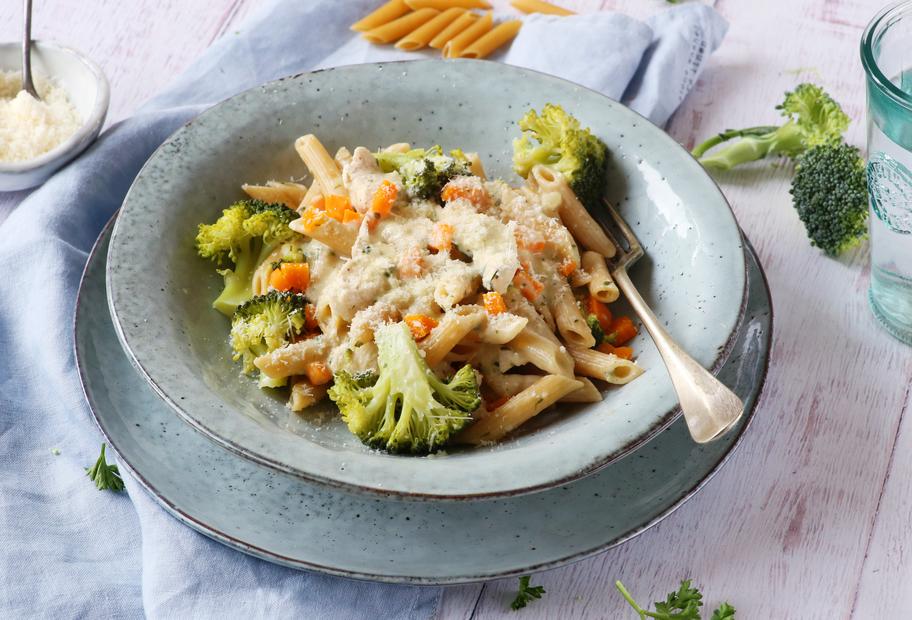 Leckere Nudeln Mit Einem Gemuse Hahnchen Mix An Einer Leichten Fitness Sahnesauce Basic Fitness